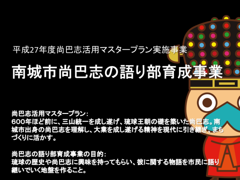 平成26年度にスタートした尚巴志の語り部育成事業が今年度平成27年度も継続し、その運営をハトコラボが引き続き行っていきます。 昨年度できあがった尚巴志に関する「10の物語の種」を発展させて、舞台にのせることができる台本にまで作り上げていこうと考えています。今回も琉球史には上里隆史先生。創作には富田めぐみ先生にご協力いただき、参加者の主体性を最大限に活かし、今を生きる私たちの尚巴志物語を作っていきます。 講座は9月から始めまります。これから参加者公募方法をつめていきます。ちょっと興味があるなぁ、という方がいらっしゃいましたら、お声かけください。